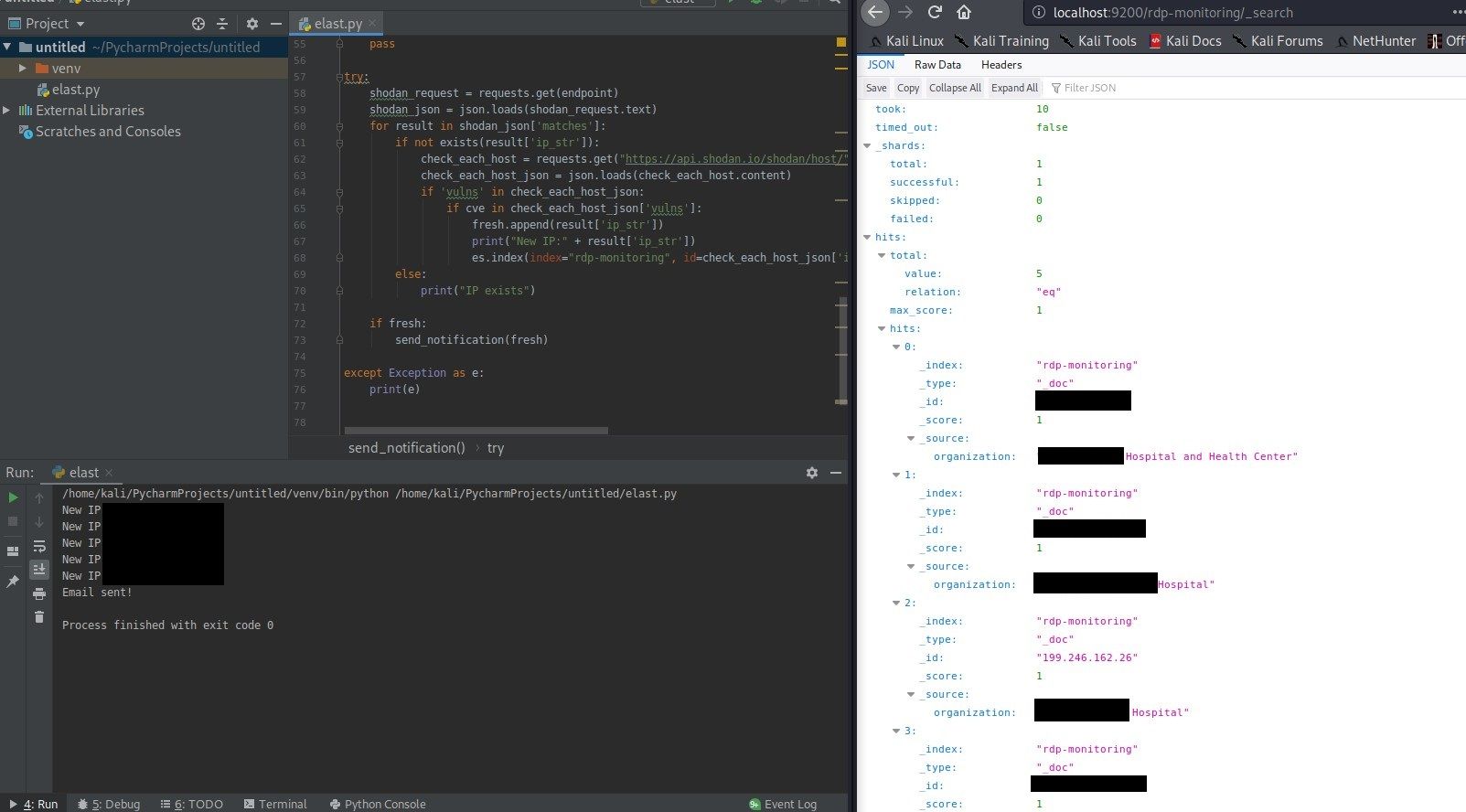 es.index(index="rdp-monitoring", id=check_each_host_json['ip_str'], body={"organization": check_each_host_json['org']})I’m using IP address as ID field, I’m doing it for simplicity and easier search without using source filtering.