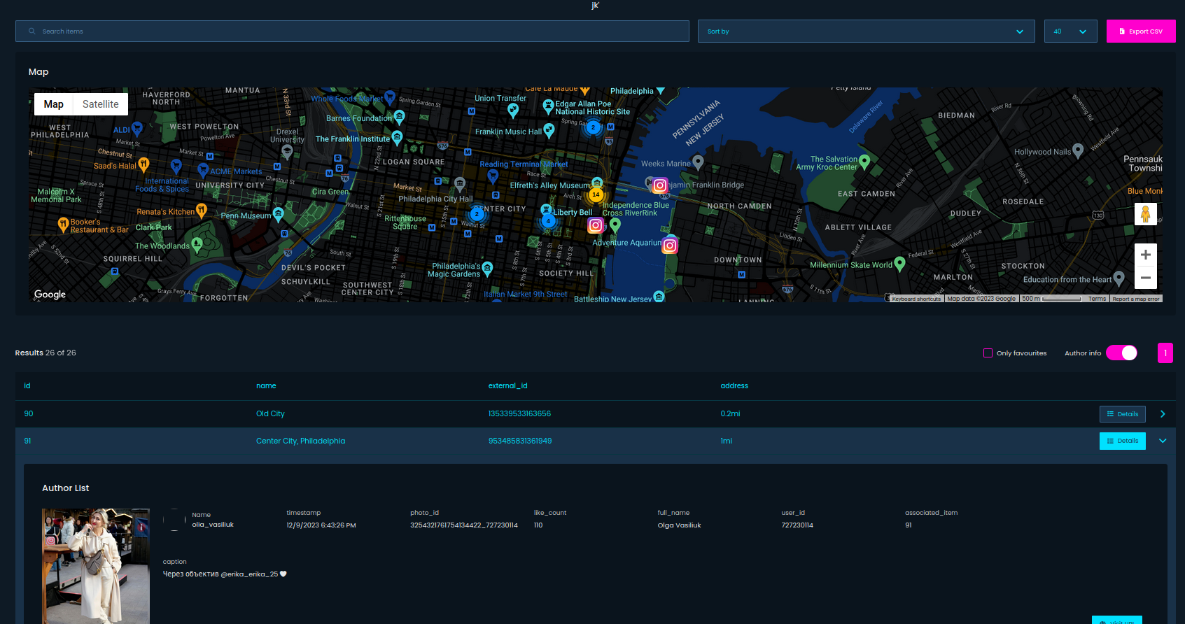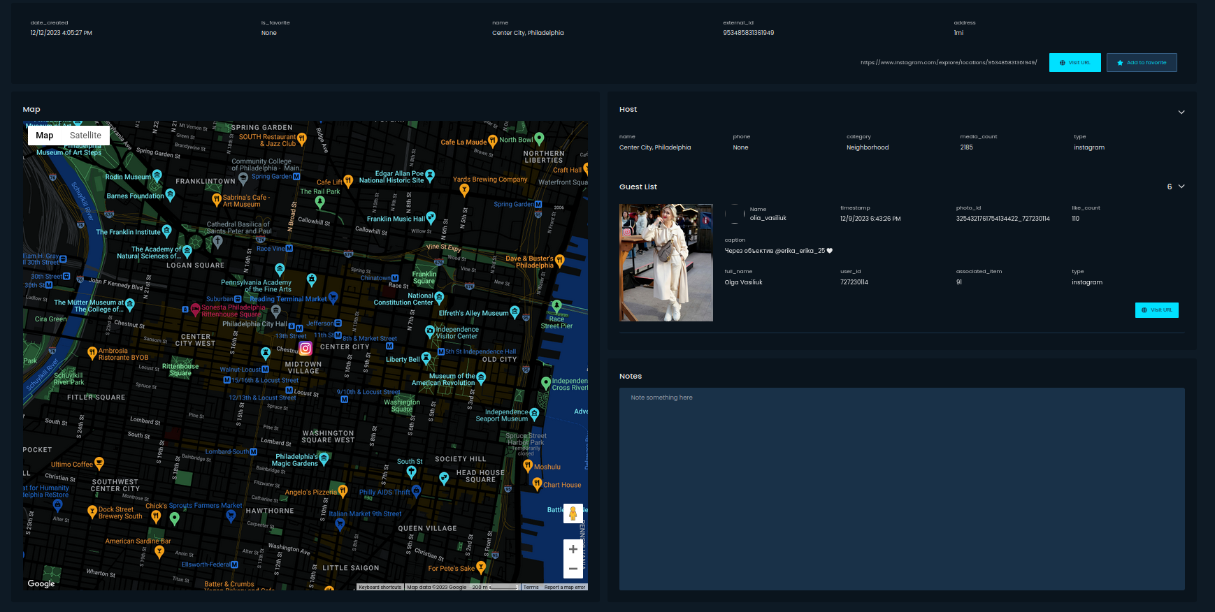 For Instagram you can download recent photos and detailed information about the place.