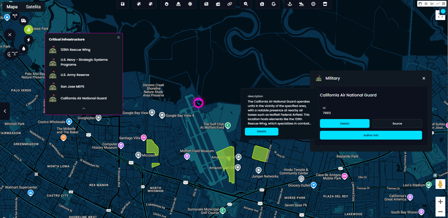 The system supports five types of critical infrastructure: Power, Water, Communication, Emergency Services, and Military. With a single click, all relevant facilities within a selected area are instantly highlighted on the map what gives immediate insight into the region strategic assets.