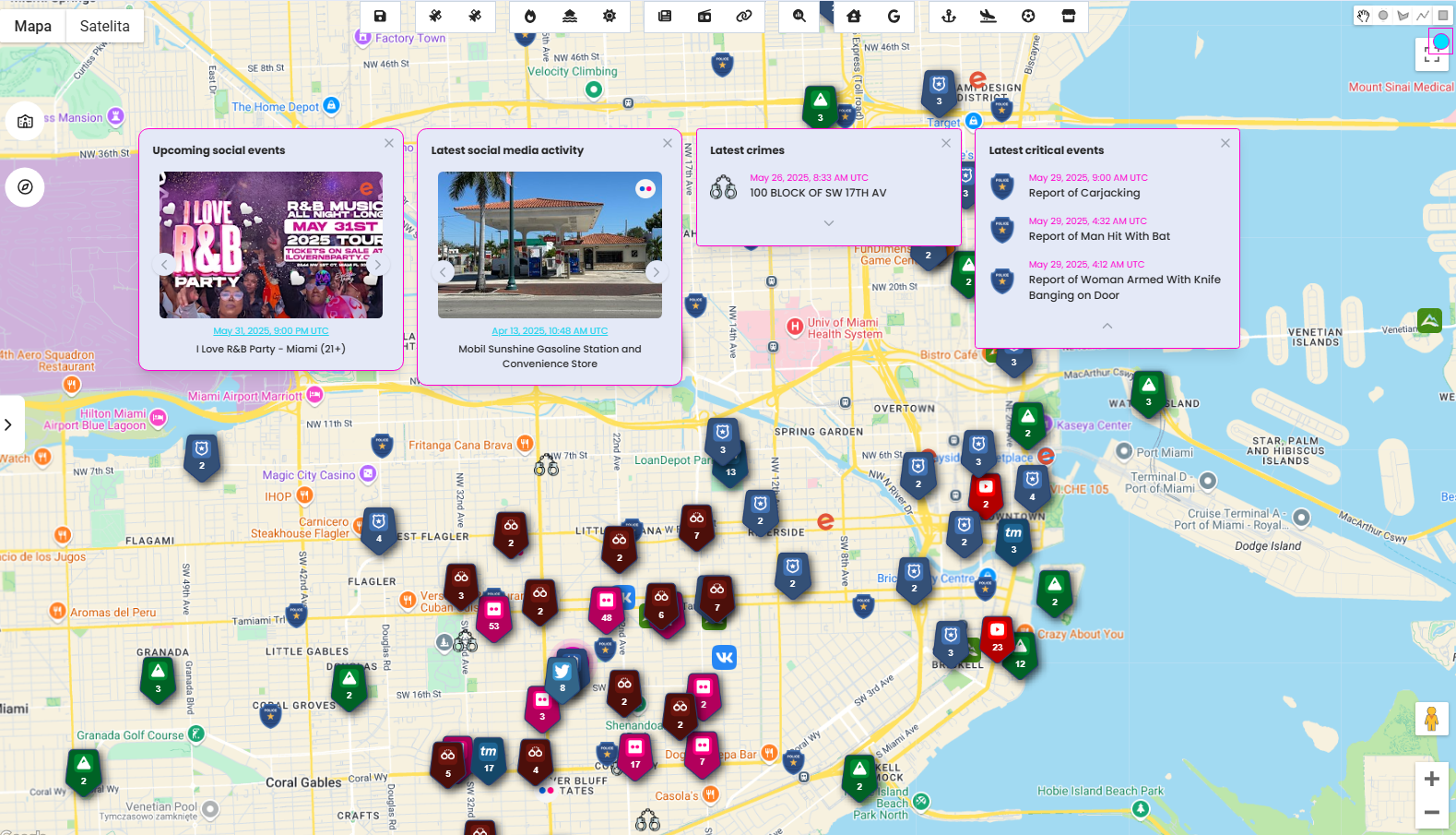 Every search returns a wealth of activity from various time ranges and sources, but in situational awareness, staying up to date is absolutely critical. That’s why the system now highlights the latest crimes, social media posts, and upcoming events directly in the search results.