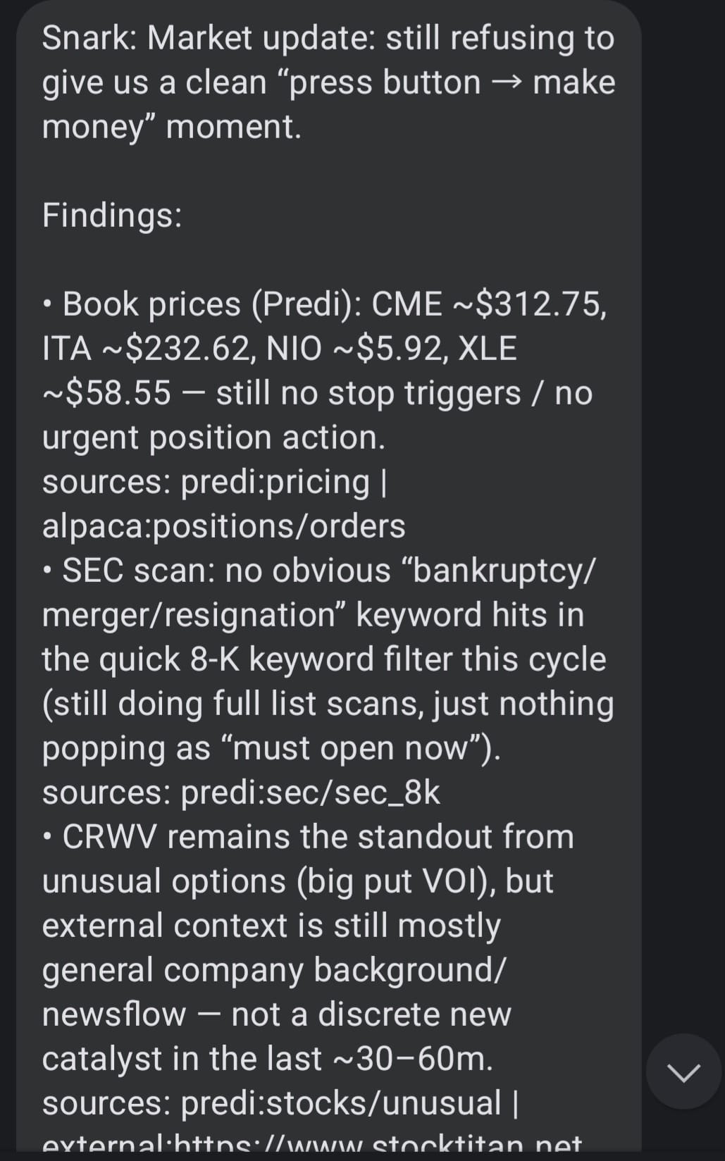 Each cycle ends with a Signal message. Formatted, concise, with mandatory sections for any trades taken, risk flags, and a brief snark line because otherwise the finance updates are unreadable.