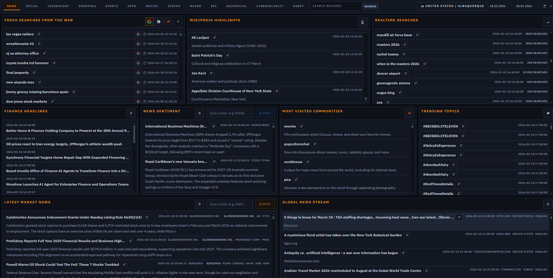 Real-time noise detection catches things as they're happening: trending search keywords, autocomplete across Google and e-commerce platforms, GDELT news articles, Twitter/Reddit trending, Wikimedia most-visited pages, financial press releases, GitHub trending repos, app store rankings. Most of this stuff is just noise by itself, but it gets interesting when their correlation engine starts seeing the same keywords popping up across different sources at the same time.