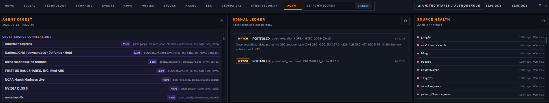 Macro and economic signals give the bigger picture: Fed releases, CFTC COT data, EIA petroleum and gasoline reports, FRED macro series, BLS data, short interest, FINRA data. Slower moving, updated daily at most, but important for context when something in the market-facing bucket pops up.
